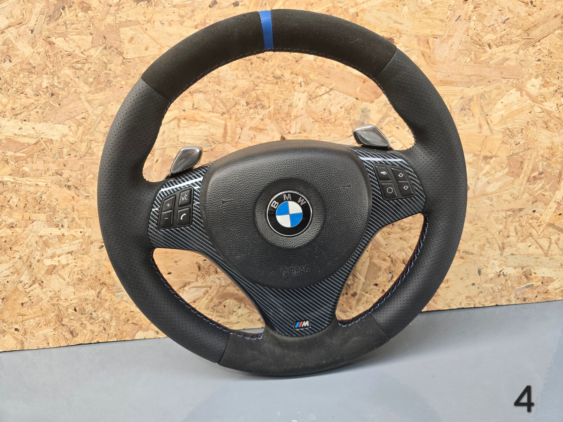 Alcântara e pele sintética perfurada com costuras M e risca azul, trime em carbono.